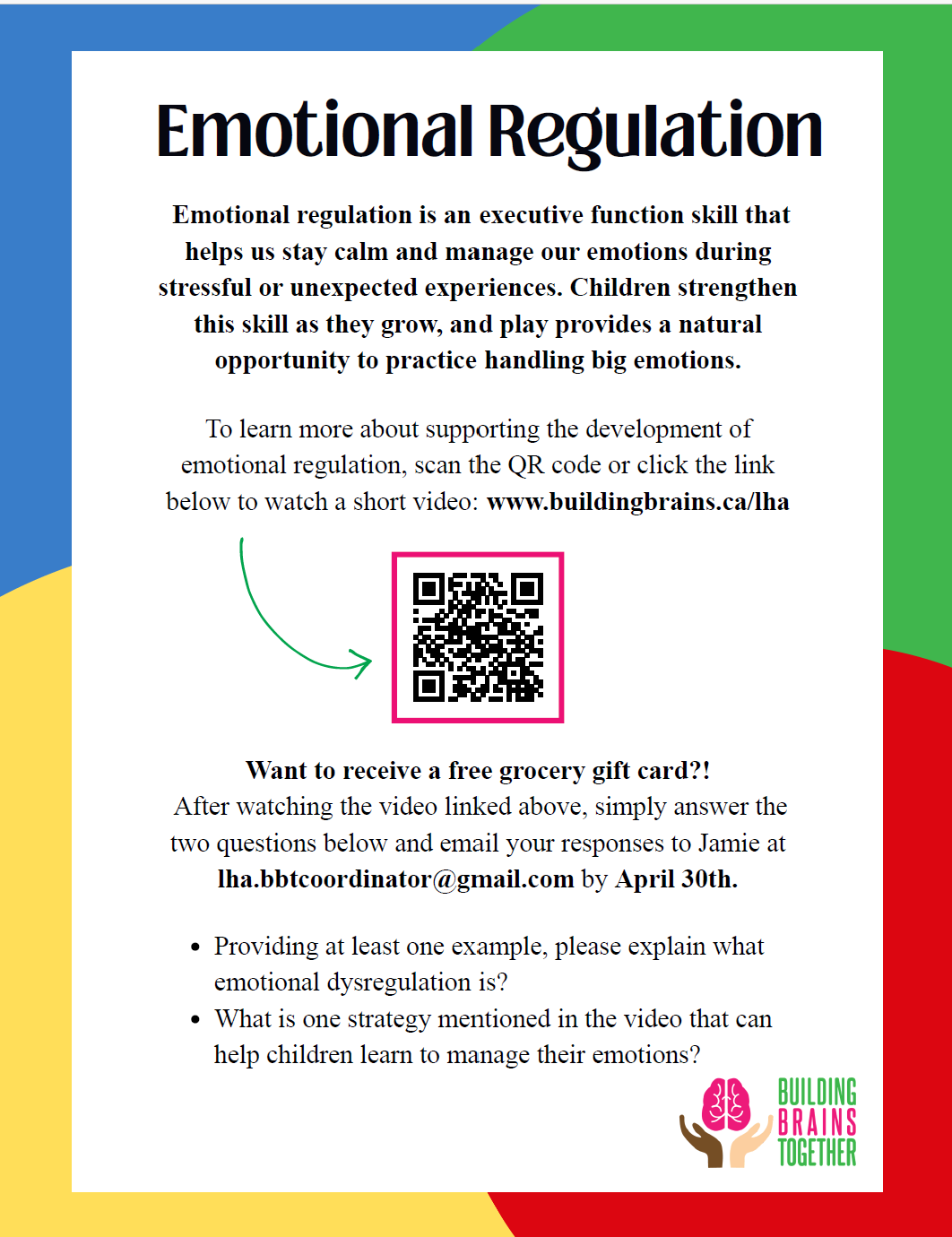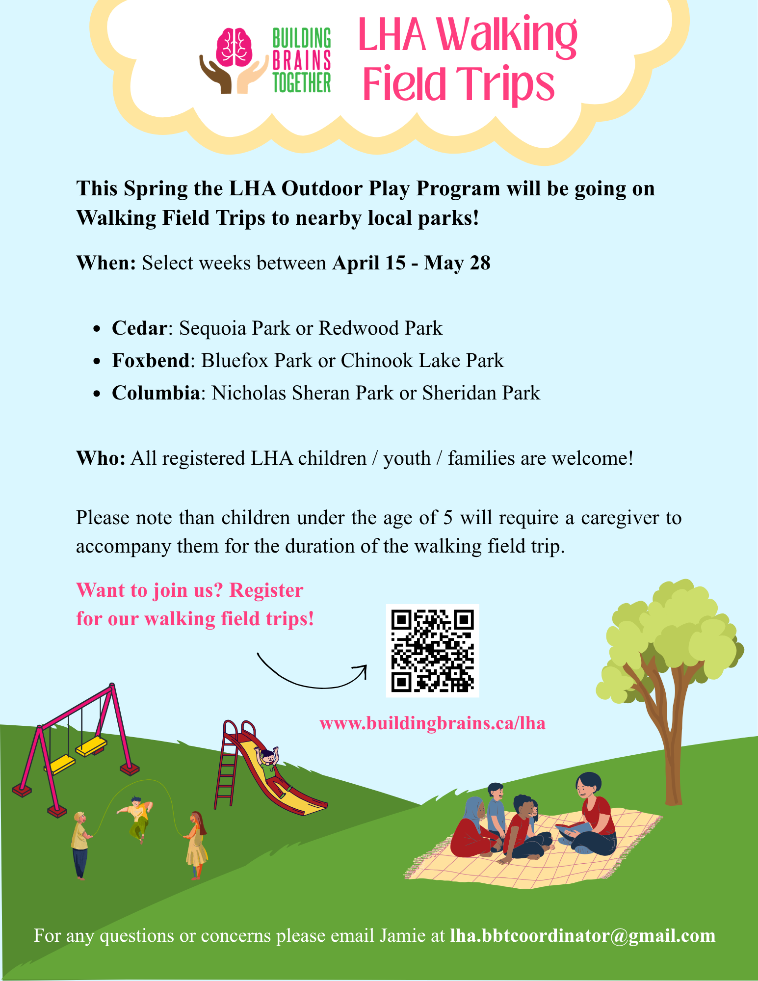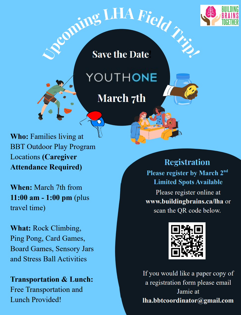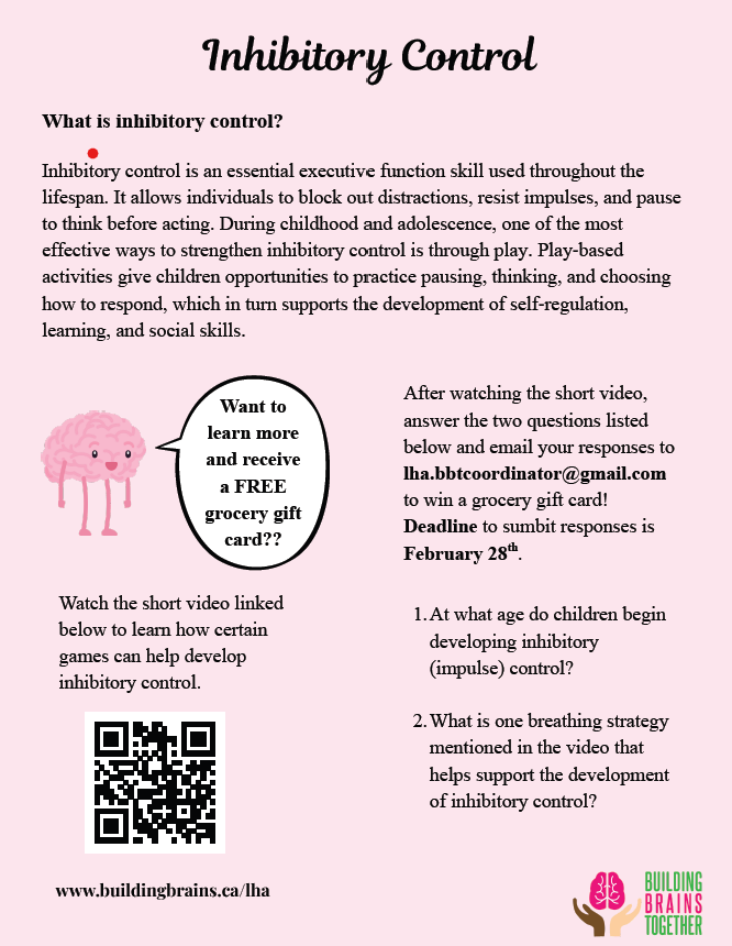 The Outdoor Play Program is offered in partnership with Building Brains Together and the Lethbridge Housing Authority. Each week, a friendly team will host a free outdoor session filled with engaging games, hands‑on activities, and nutritious snacks, creating a fun and supportive space for families to connect and play together.