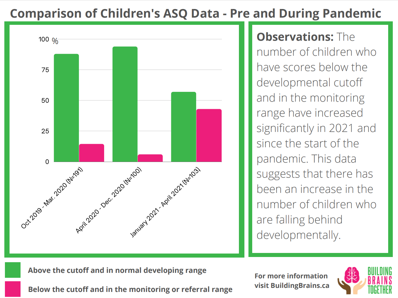This data is based on a sample of children in Lethbridge who completed the ASQ between fall of 2019 and spring of 2021. Similar findings have been reported by Unicef in Asia and in the US by Health Care Authorities.